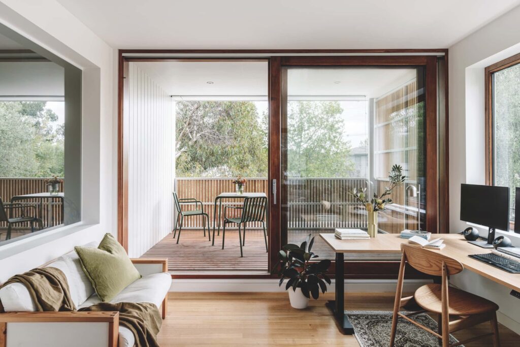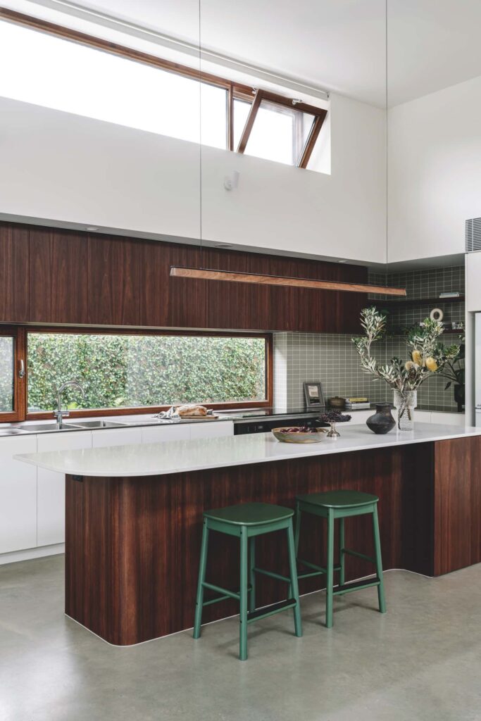This elevated space is clearly everyone’s project highlight, so let’s start there. Opening to a deep west-facing balcony that provides privacy within and a shaded outdoor space with killer sunsets, the office interior features three enormous windows bringing in views, light and fresh air from multiple directions. “It’s pretty spectacular,” the client says. “It must be the most used study ever.” It naturally invites use by everyone, day and night, all year round. Whether for yoga, study, reading, games or impromptu magazine interviews, it’s a serene eyrie delivering precisely the mesmerising vistas, thermal comfort, and moments of contemplation it was designed for. “I really like how it’s always the right temperature,” says the clients’ teenage daughter. “Warm in winter and cool in summer.”