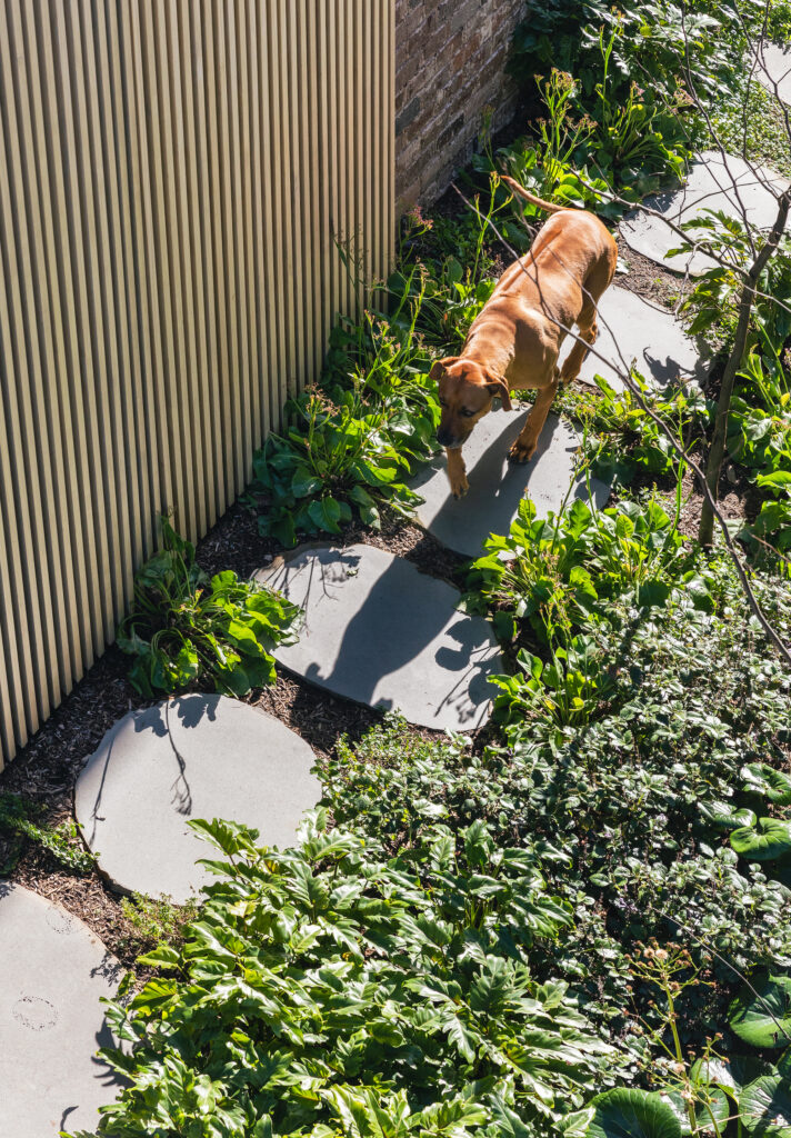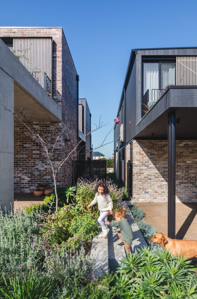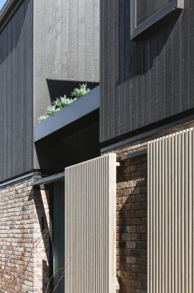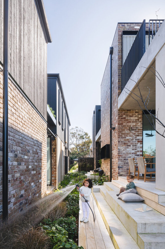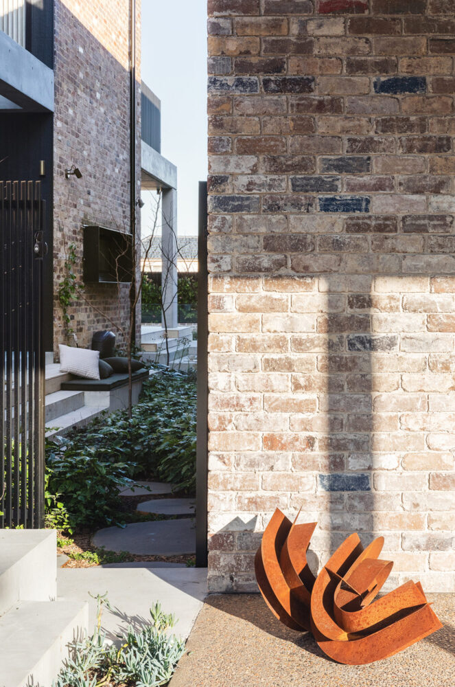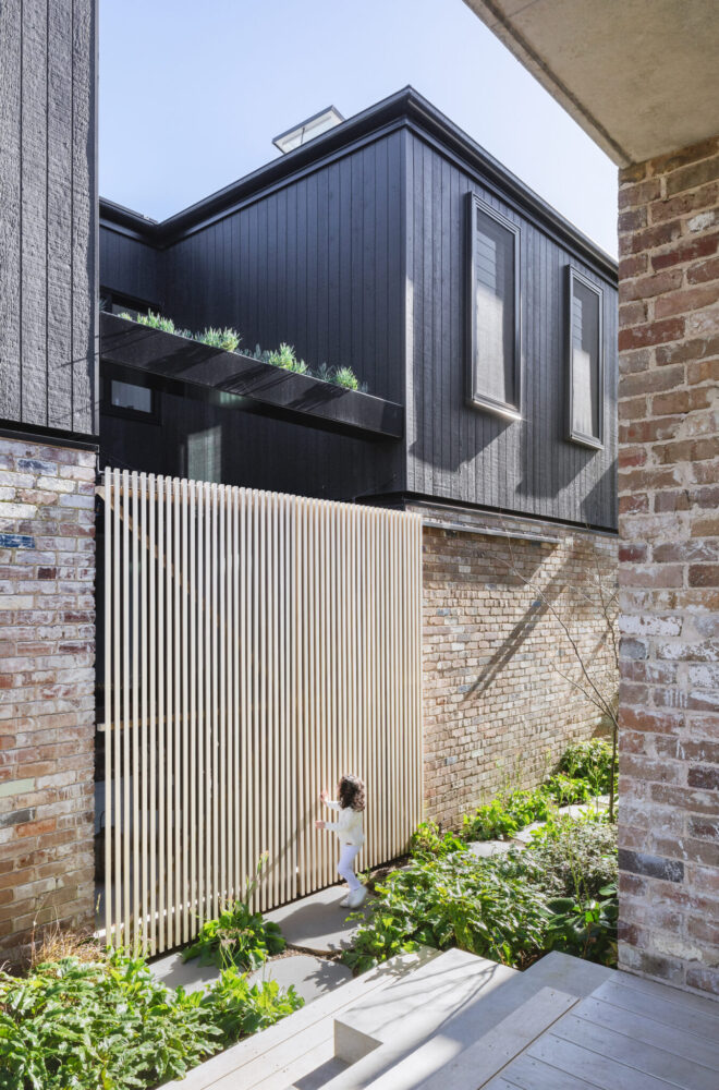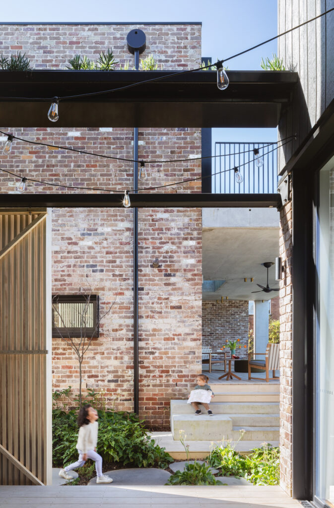 Planting is woven into the architecture wherever possible. Blue chalksticks (Senecio serpens) will trail down from the planter above the sliding timber screens, and in time wisteria will climb up the brick walls. Sharon also developed rooftop gardens at the front and back of both houses to green the edges of the architecture on the upper levels.The physical and visual connection between the two buildings means this garden can be shared by all family members and enjoyed in different ways throughout the year. It’s a space that packs a punch far bigger than its size and is a beautiful celebration of the uniqueness of its adjoining sites.