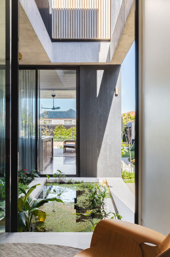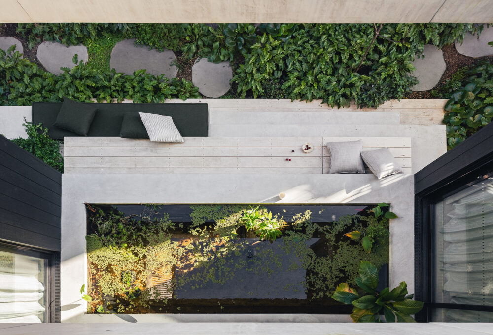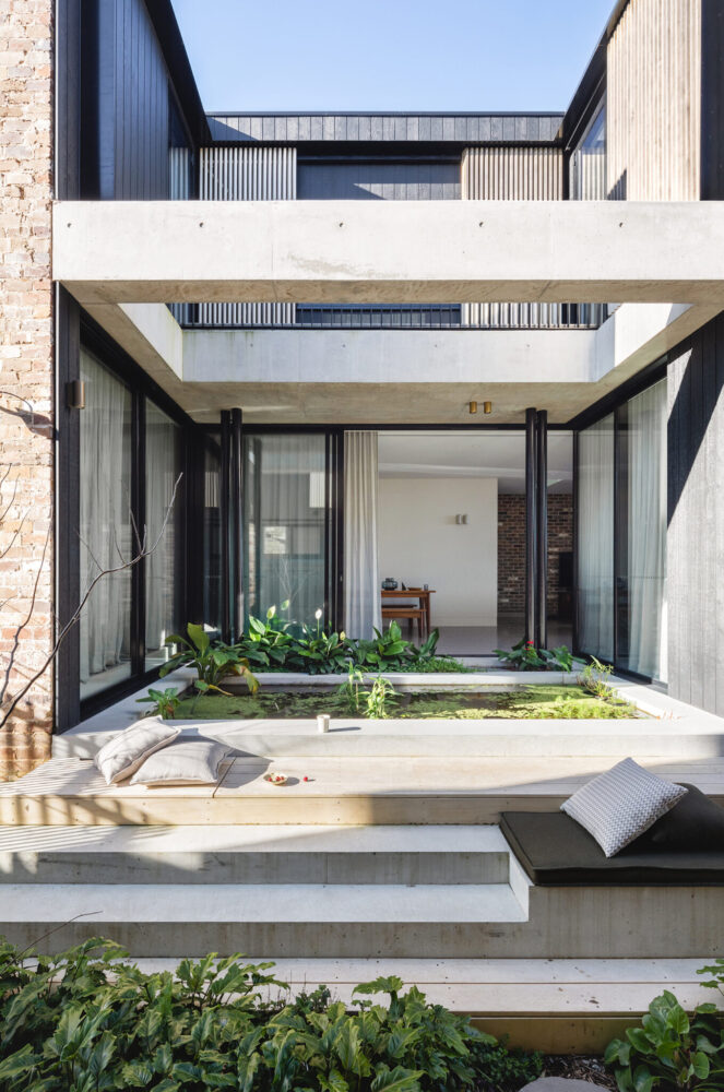 As the summer sun streams in from the north in the middle of the day, external spaces inset within the buildings – a fishpond, courtyard and deck – provide cool respite in the shade. In winter, the concrete and timber steps are bathed in sun and serve as places to relax and gather in the warmth. “The owners can put cushions on the steps and the garden becomes a large outdoor living room that everyone can share,” Sharon says. The steps also provide easy access to and from the adjacent duplex where a sliding timber door opens and closes the internal courtyard to the garden. Bluestone pavers meander through the garden, and both the steps and pavers are places for the grandchildren to run and play.