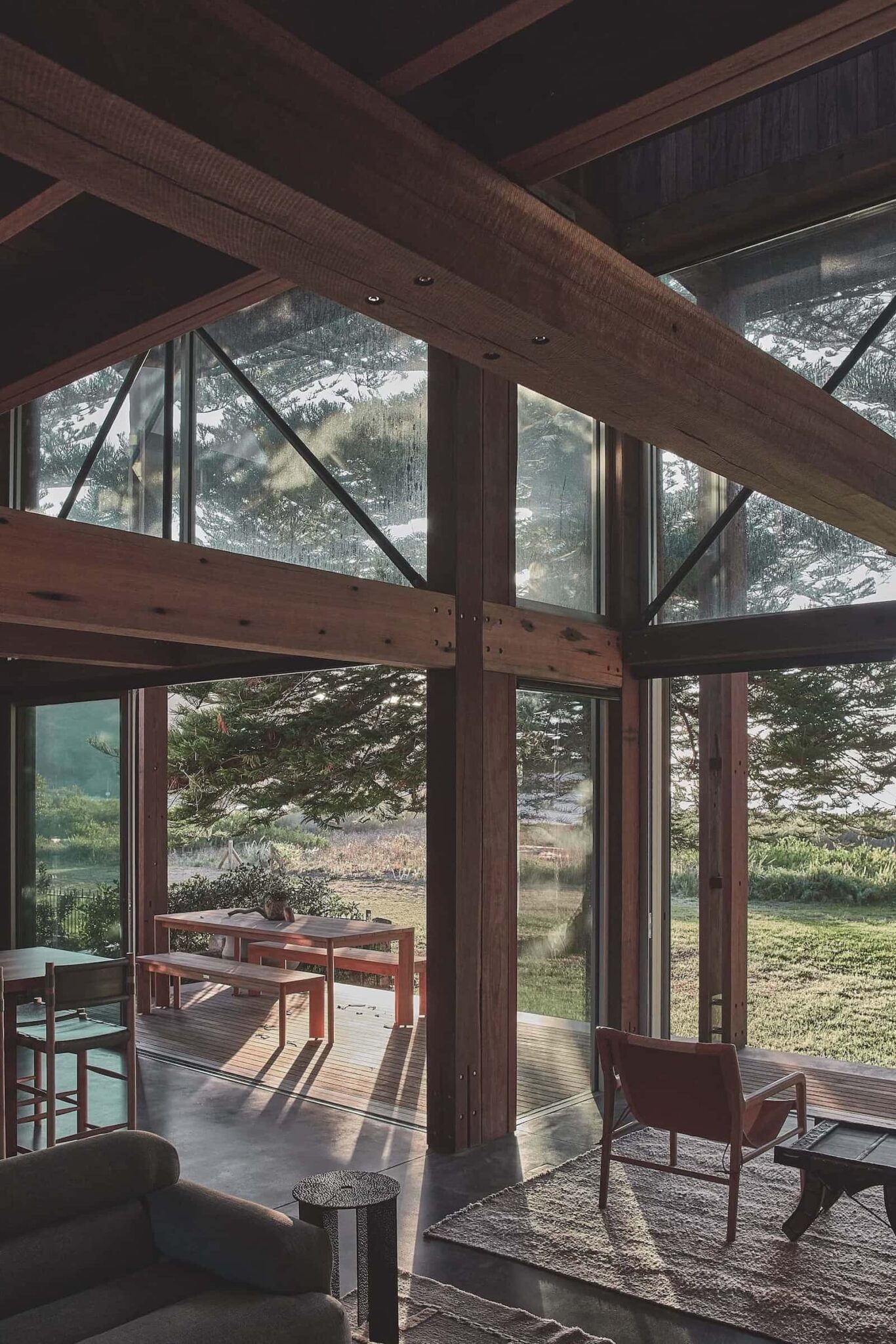 Materially, the house is almost entirely raw timber, inside and out – a direct response to the harsh coastal setting. “In a place like this, any form of paint becomes an endless job of maintenance,” Rob says. Rough sawn spotted gum boards wrap the exterior, which will slowly weather to a driftwood grey; or as Rob describes it “an old log on the beach”. Internally, there is no plasterboard in sight – just timber lining, the expressed structure and joinery. It makes for a warm environment and ensures nothing feels too precious to withstand the whims of nature.