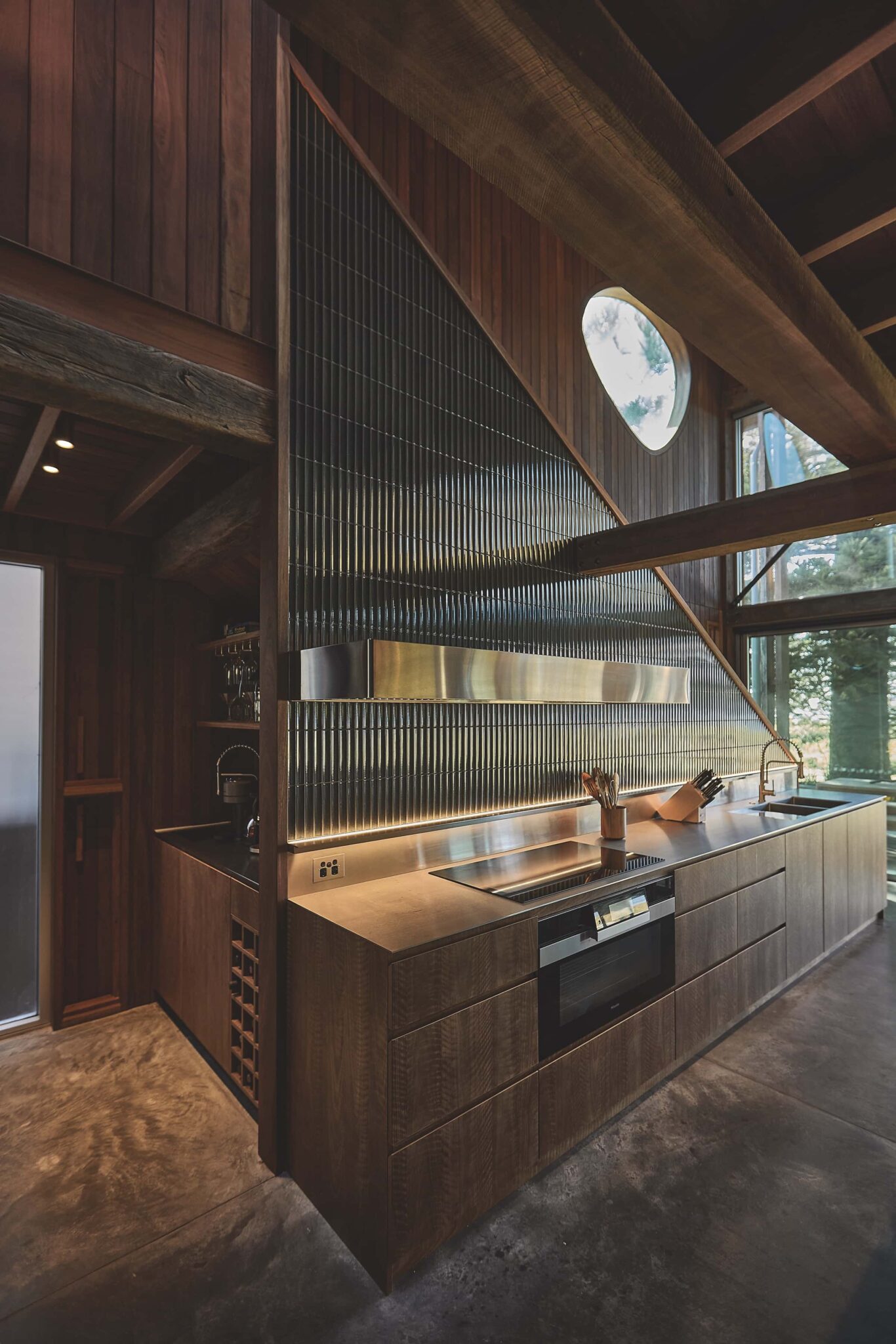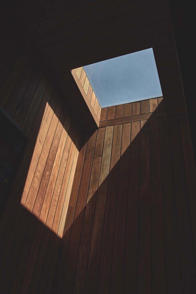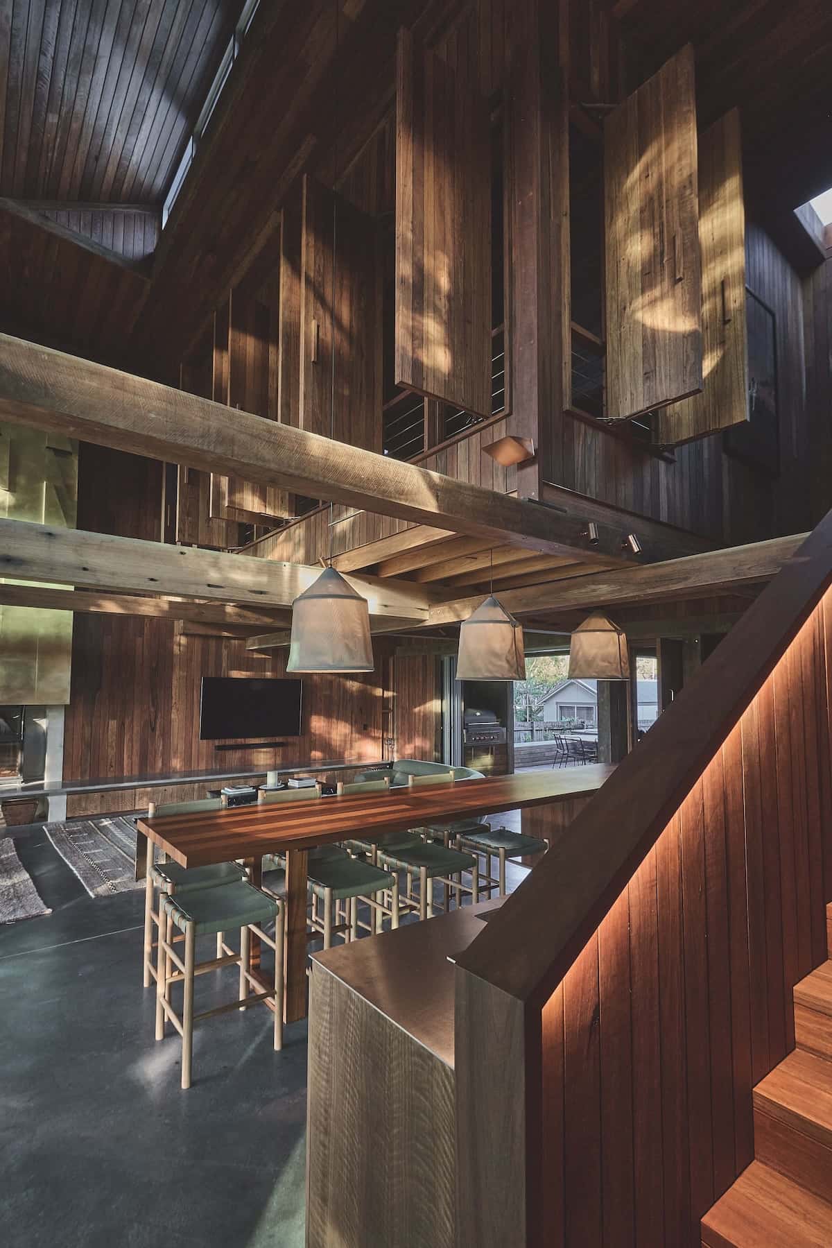 The ground level has a polished concrete slab for improved thermal mass. The first floor is all spotted gum floorboards. The main volumes are of highly insulated, lightweight, mainly timber-framed construction clad internally and externally in recycled spotted gum boards rough sawn externally and left to weather to a driftwood grey while internally oiled to create a durable patina. The interiors feature expressed recycled timber posts and beams from Thor’s Hammer in Canberra.