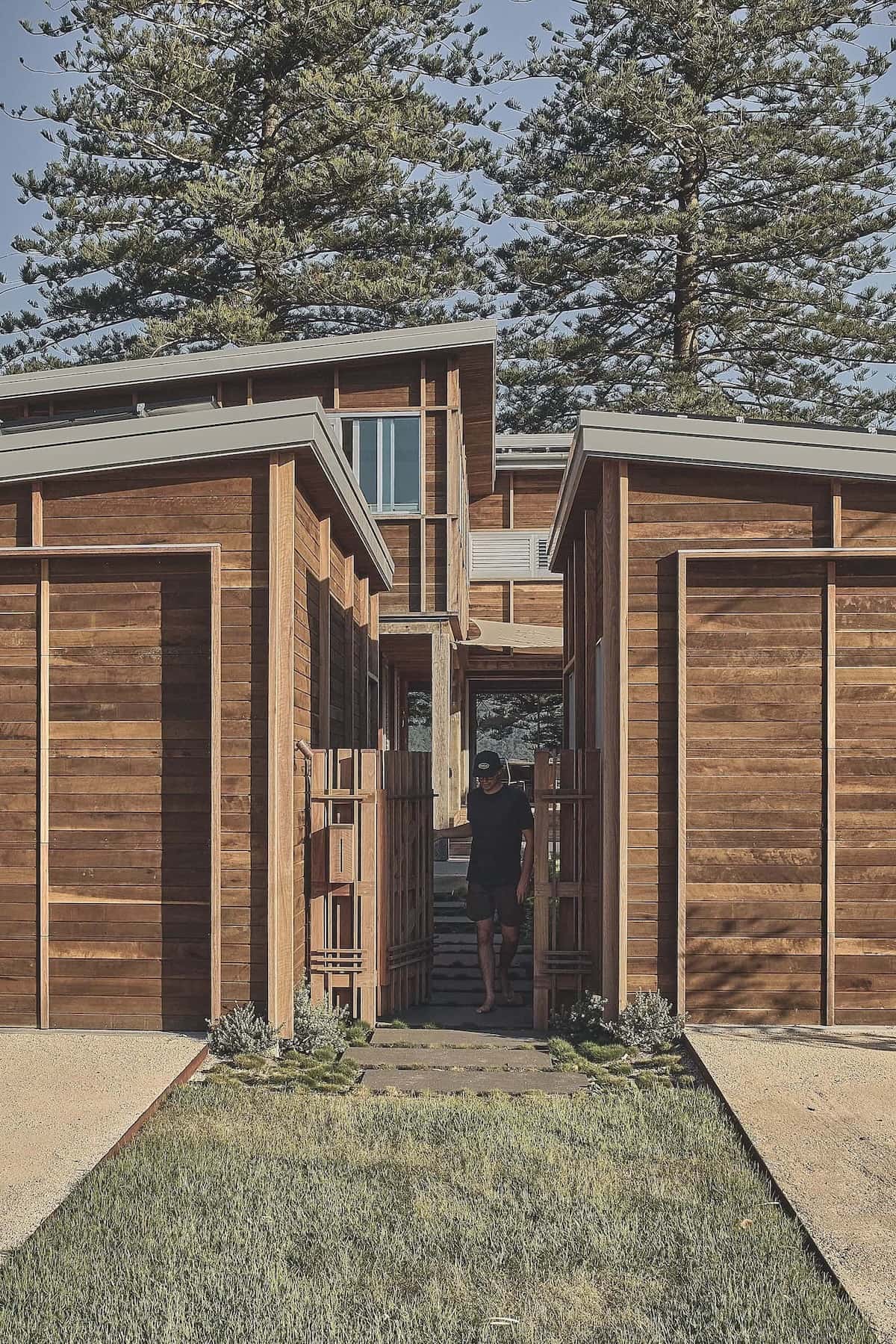 Context is omnipresent and does the heavy lifting in this project. The house sits on an east–west axis, facing the beach and Broken Bay to the south-east, flanked closely by neighbours on either side and fronted by two of those mature Norfolk pines. As Rob describes it, it’s “an aggressive maritime environment”. Southerly winds regularly whip up salt and sand. In winter, though, the afternoon sun drops warmly into the block. These patterns of light, wind, view and exposure were the project’s starting point.