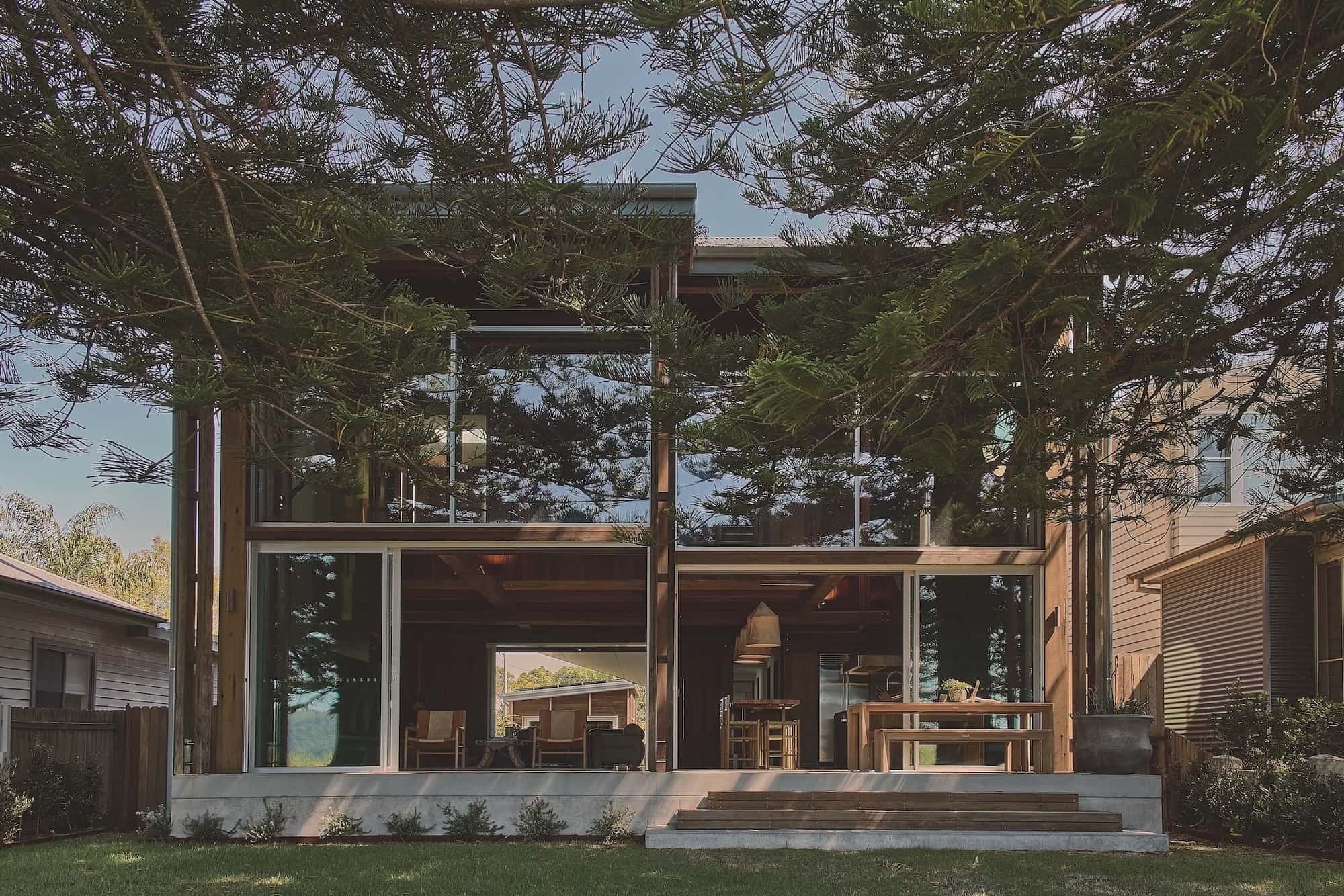 Patonga Beach, north of Sydney, is a quiet, coastal community set within a cove where the Hawkesbury River snakes away from the ocean. Tall Norfolk pines act as sentinels along the beachfront, standing guard in front of Patonga House.