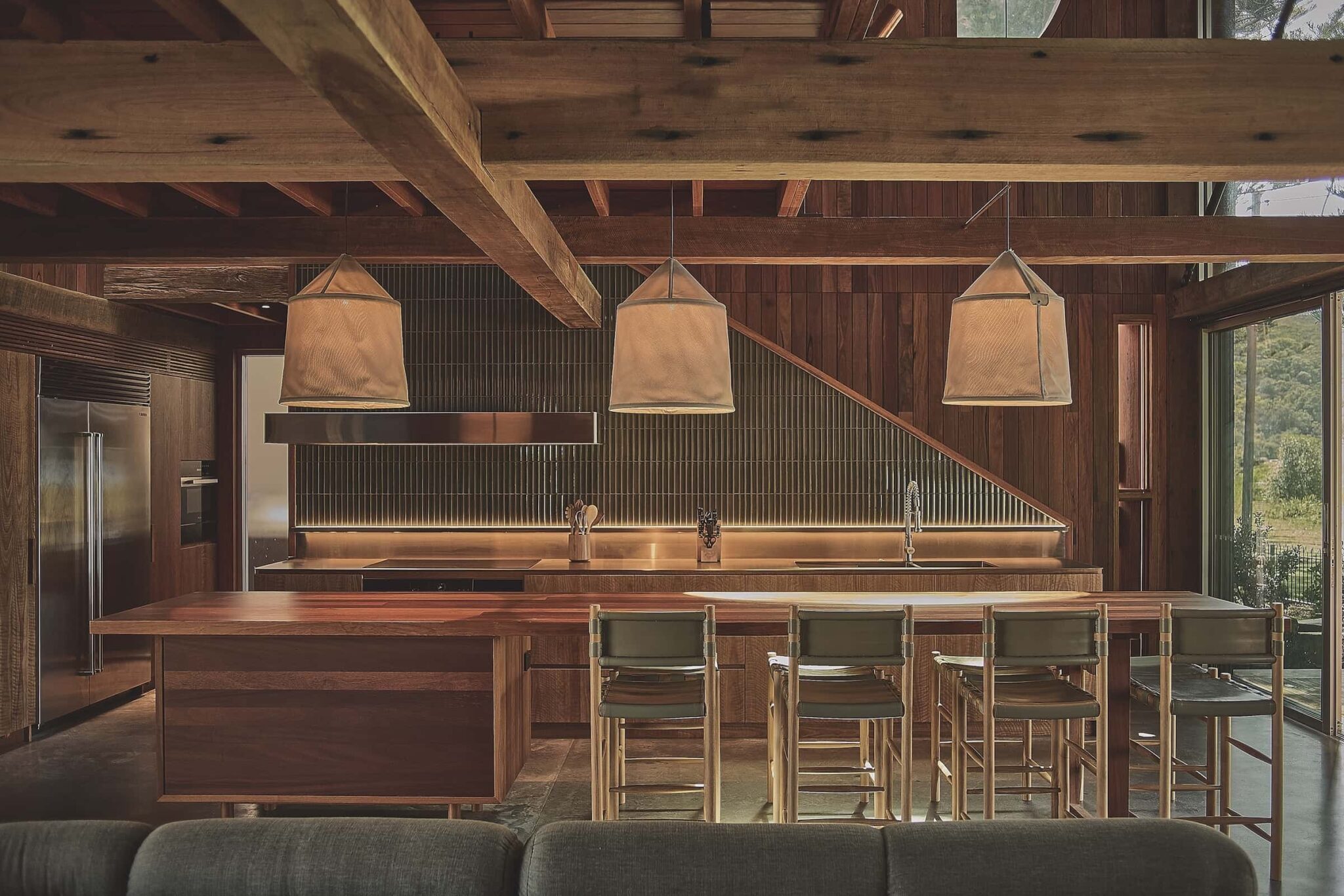 Much of the structure comes with its own history. Large beams were salvaged from a disused bridge over the Clarence River, vastly oversized for their new loads but perfect for a house that will continue to wear in, rather than out. “These timbers last forever if they’re not damaged or termite ravaged,” Rob explains. The kitchen island bench is made from reclaimed Burmese teak, also salvaged, this time from a CSIRO laboratory in Canberra, with help from recycling specialists Thor’s.