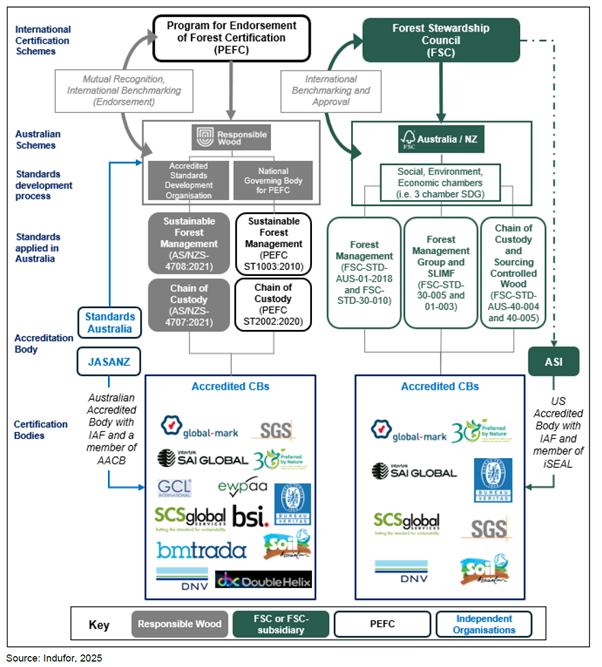 Forest management and chain of custody certification scheme arrangements in Australia, sourced from Forest and Wood Products Australia, Report May 2025: