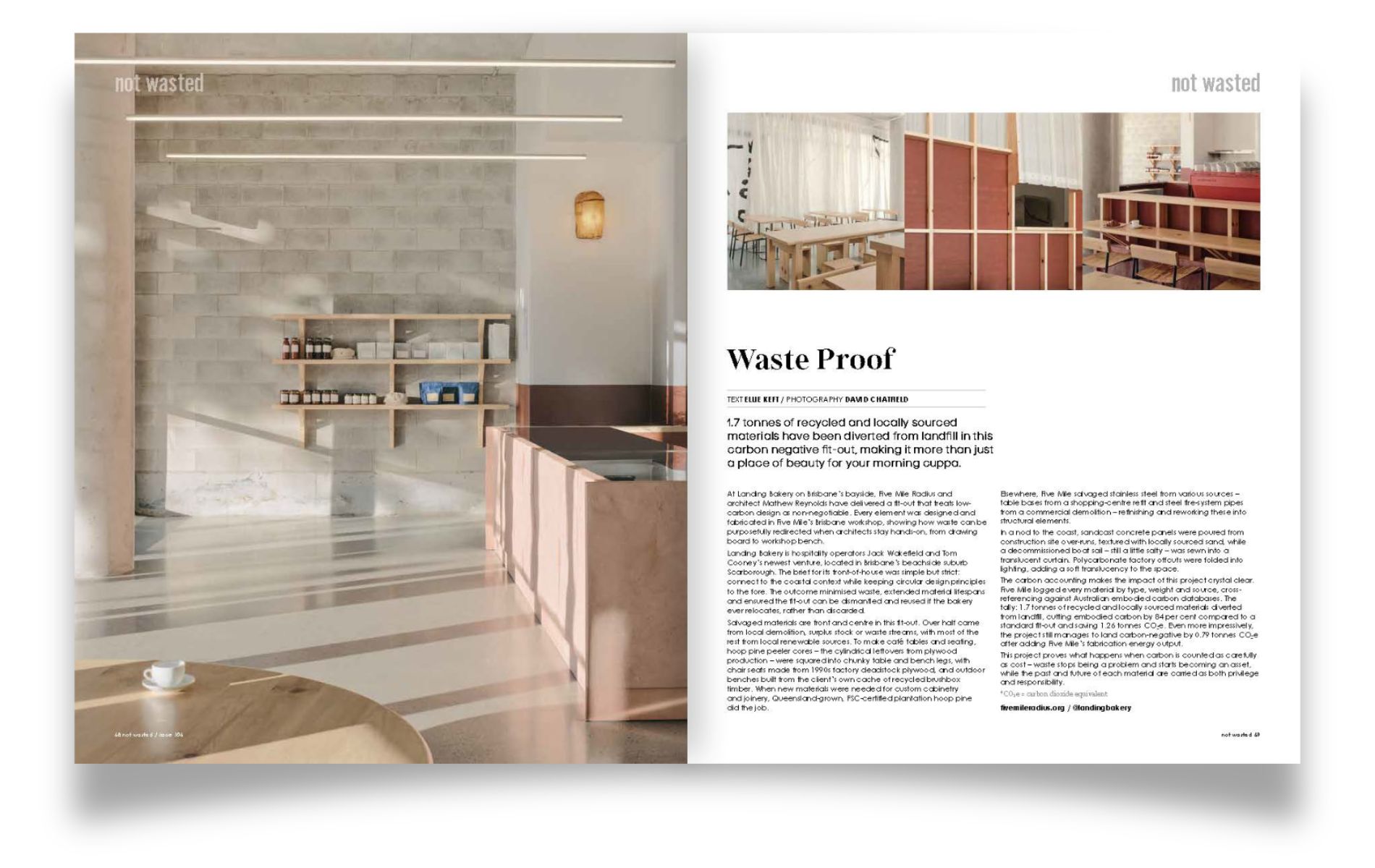 In our Not Wasted feature; Five Mile Radius and Mathew Reynolds craft a carbon-negative fit-out for Landing Bakery, logging materials to divert 1.7 tonnes from landfill and cut embodied carbon by 84 per cent.