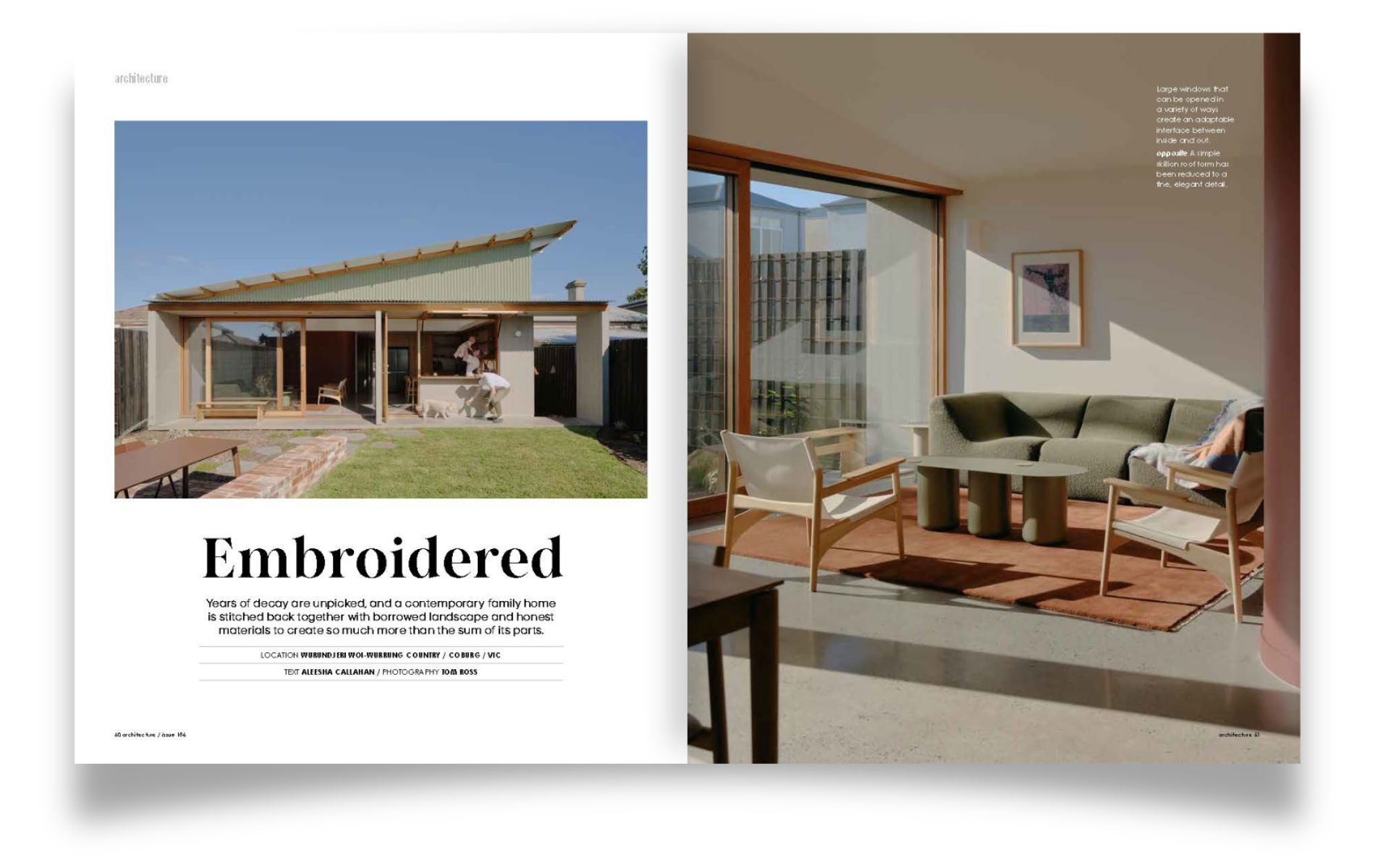 Embroidered by CARD Studio unpicks decades of decay to stitch a compact Coburg cottage back together, doing more with less through raw, durable materials, a precise roofline and a garden-first interface.
