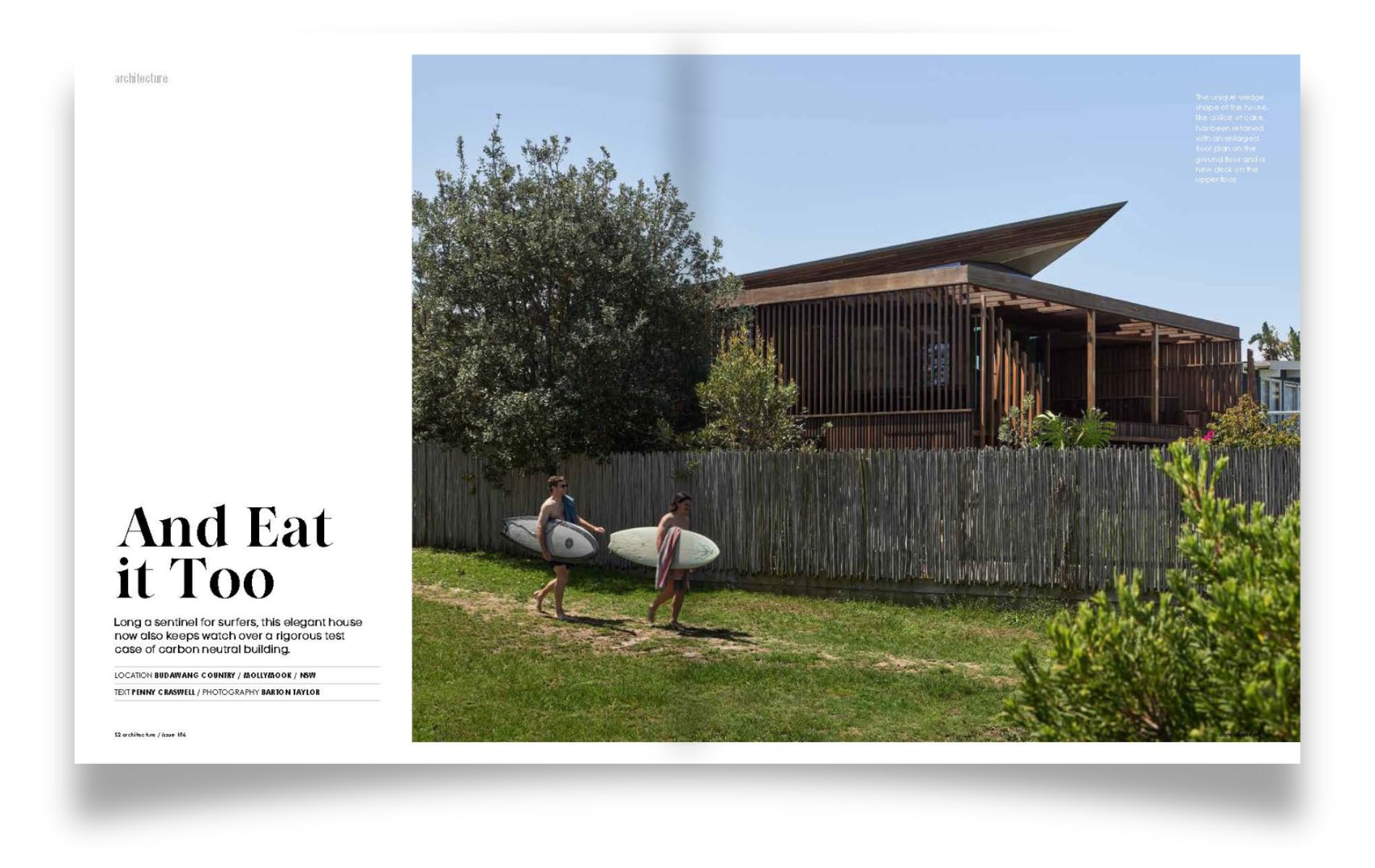 And Eat It Too by Alexander Symes Architect respectfully renews an iconic Mollymook landmark as a rigorous test case in low-carbon building – airtight envelope, recycled timbers and on-site renewables – without losing the surfers’ beloved “cakey” spirit.