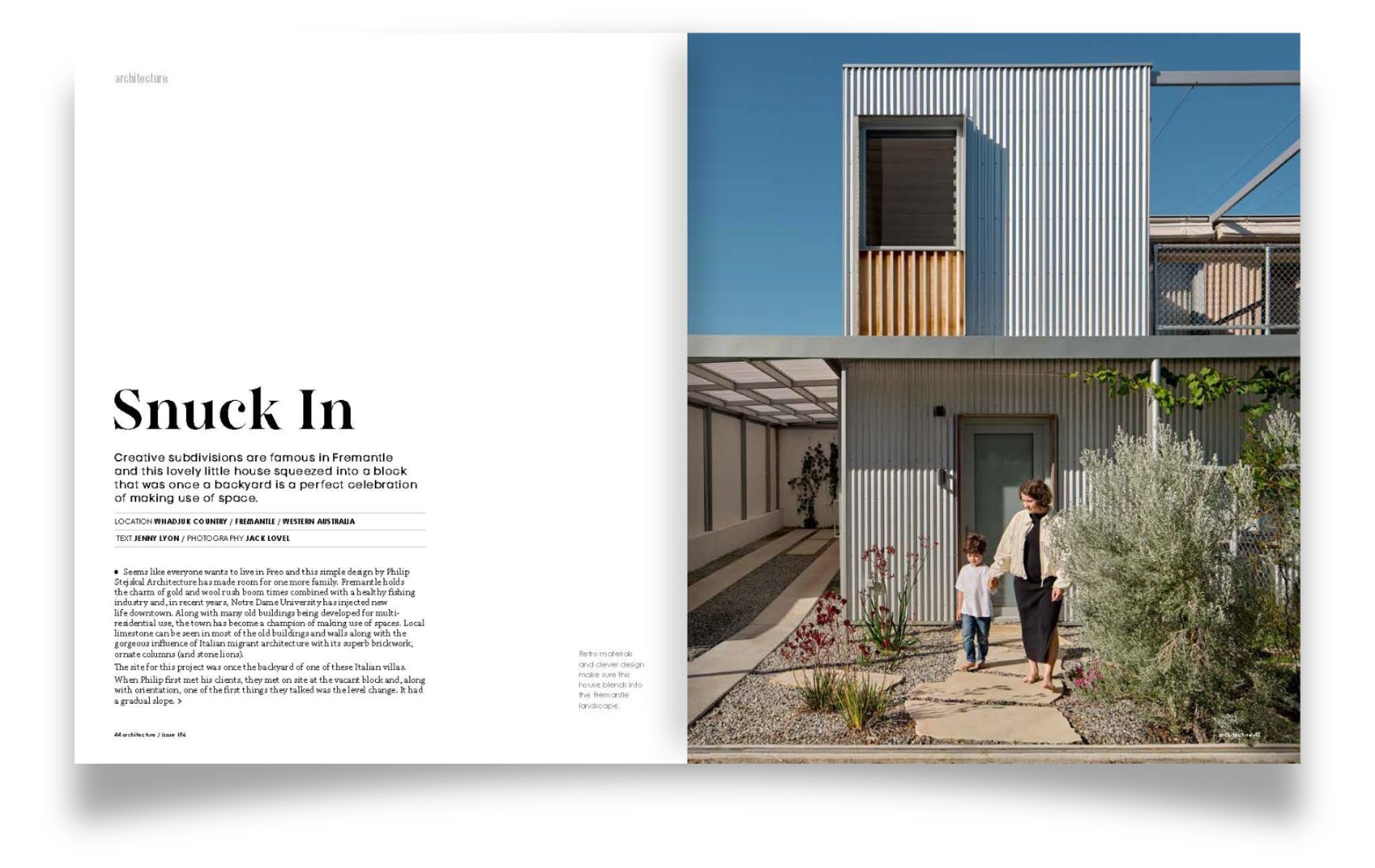 Next up, Snuck In by Philip Stejskal Architecture tucks generous volume and borrowed views into a Fremantle backyard, pairing zincalume, timber and wire mesh with sea breezes and deft, everyday practicality.