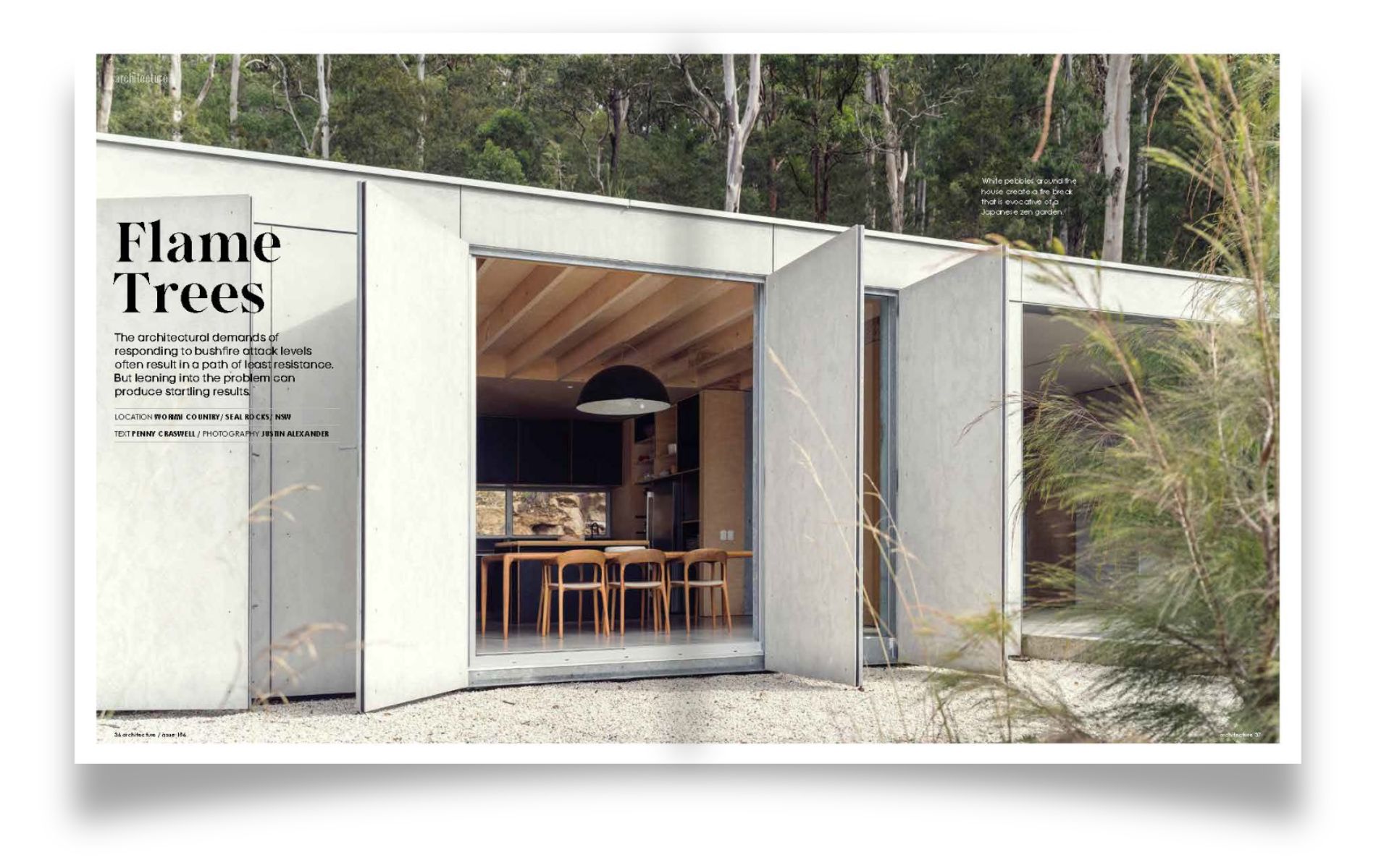 Then, Flame Trees by Jason Gibney Design Workshop embraces a BAL–Flame Zone site with operable metal-mesh shutters and a bespoke façade system that folds the house into a protective shell, opening to the sky, breeze and bush.