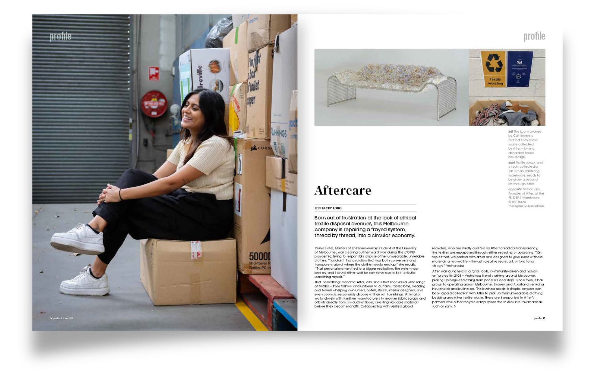 In this issue, we profile After, founded by Yesha Patel to divert textile waste from landfill through transparent recycling and creative reuse, scaling from households to manufacturers and councils while building a circular, on-shore future for textiles.