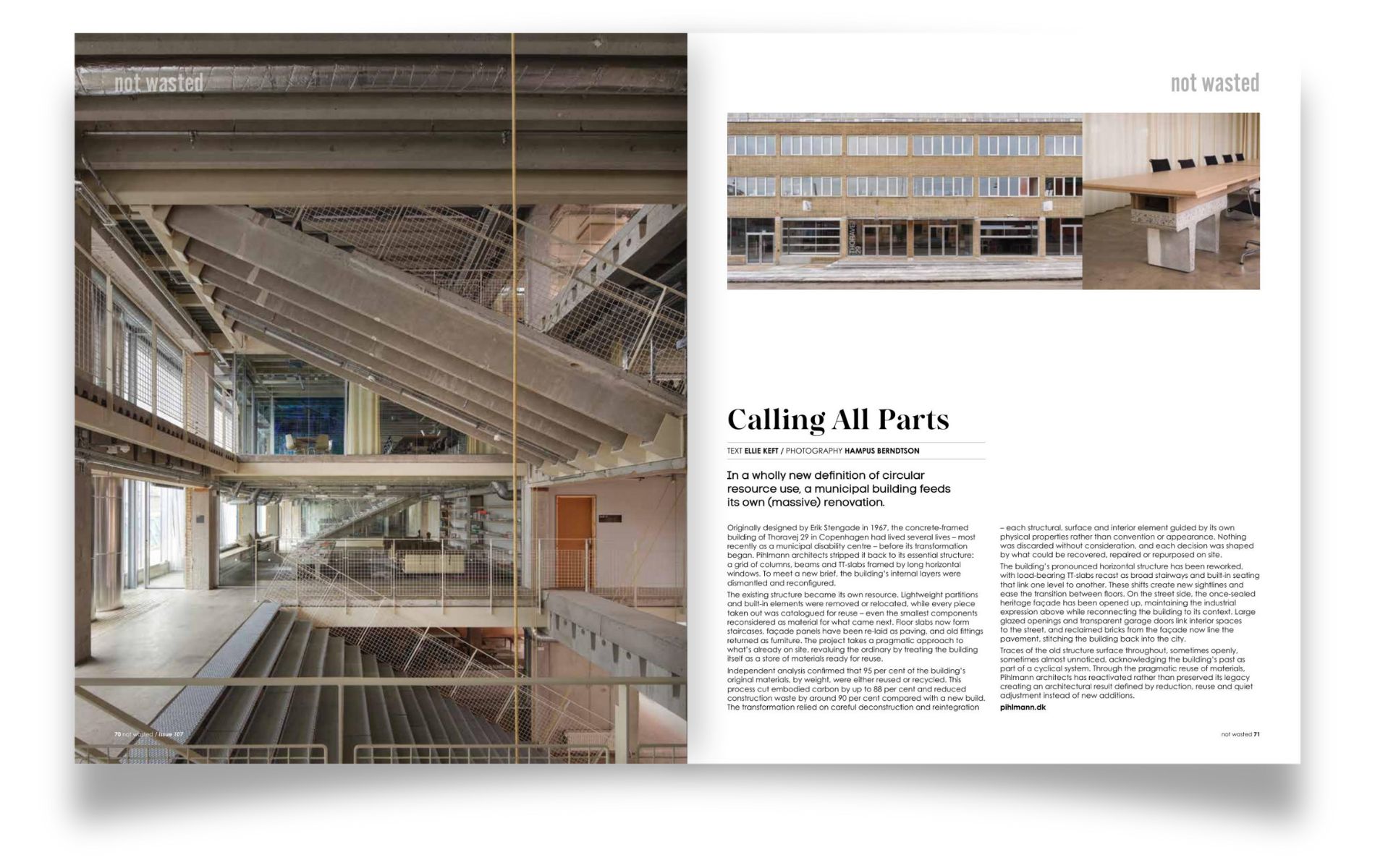 In our Not Wasted feature, a concrete-framed municipal building in Copenhagen becomes its own material resource. Originally designed in 1967, the structure was stripped back and carefully dismantled, with floor slabs, façade panels and fittings catalogued, reused or recycled on site. The project demonstrates how reduction, reuse and reintegration can radically cut embodied carbon while preserving architectural character.