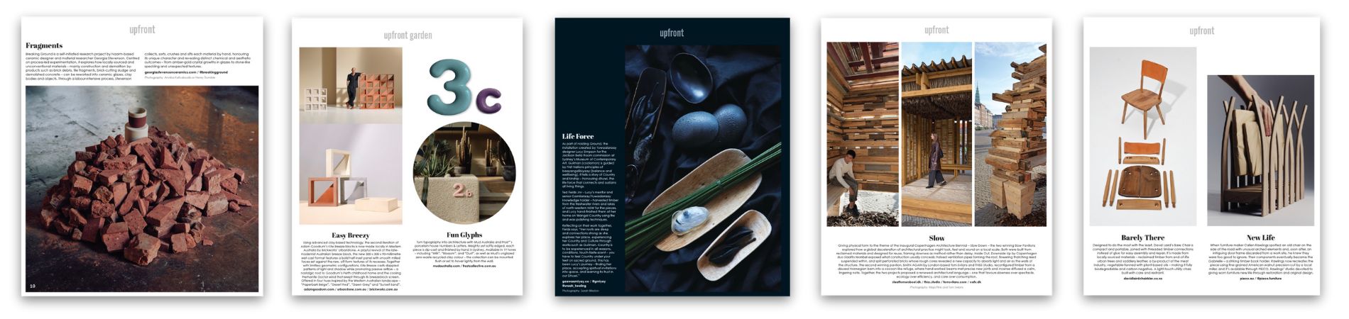Our regular Upfront section showcases projects, practices and ideas we love — including Ash Allen, Jason Gibney Design Workshop with Ian Monty, the Robin Boyd Foundation and Melbourne School of Design, Lucy Simpson with Ted Fields Jnr, the Copenhagen Architecture Biennial, Slaatto Morsbøl, Tom Svilans and THISS Studio, David Laird, Callen Rawlings (PIECO), Alison Jackson (Ferro Forma), Escultura, Georgia Stevenson, Ross Gardam with Stylecraft, and Russo Betak.