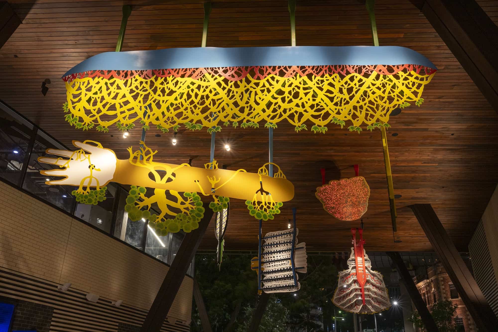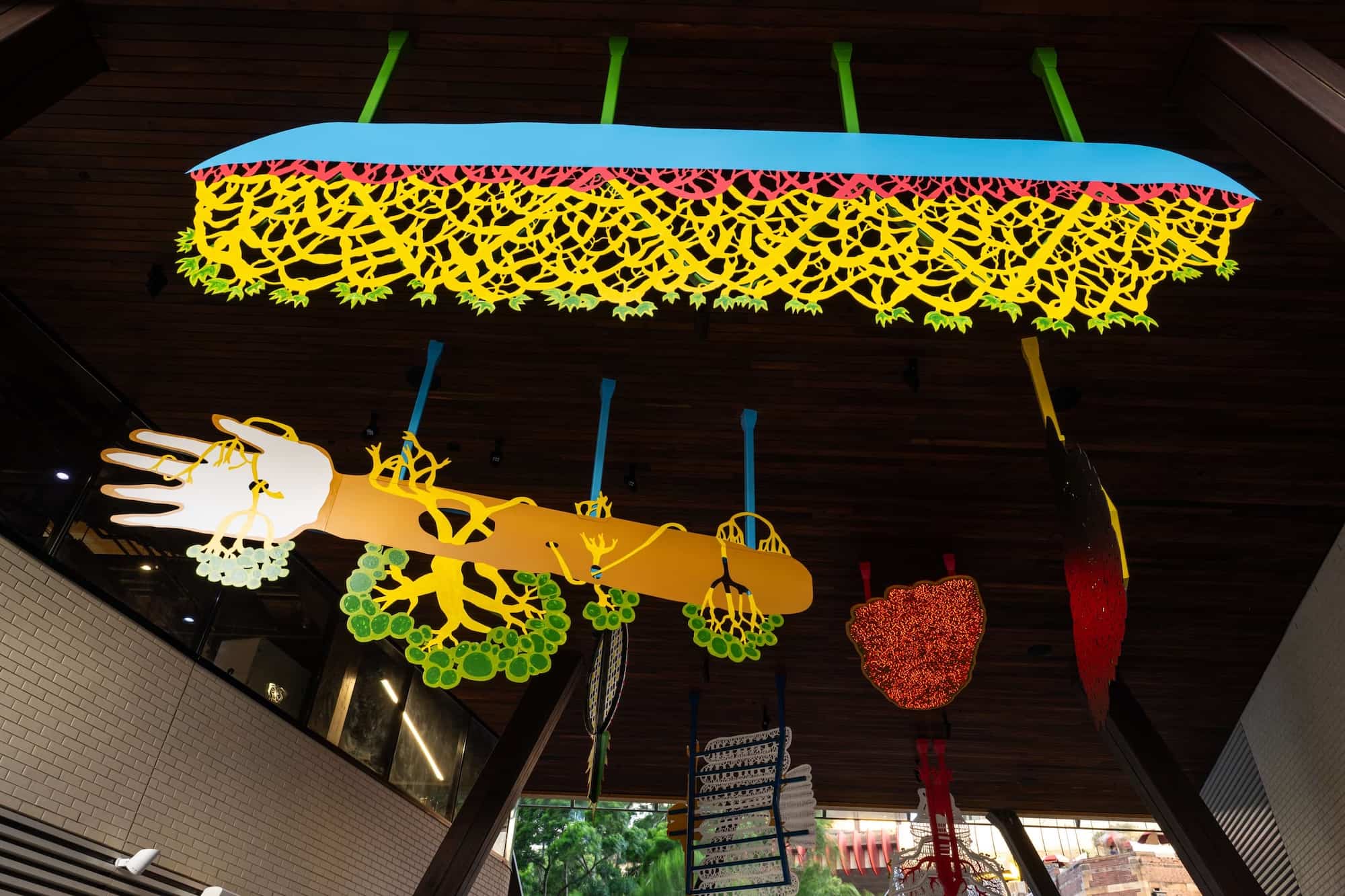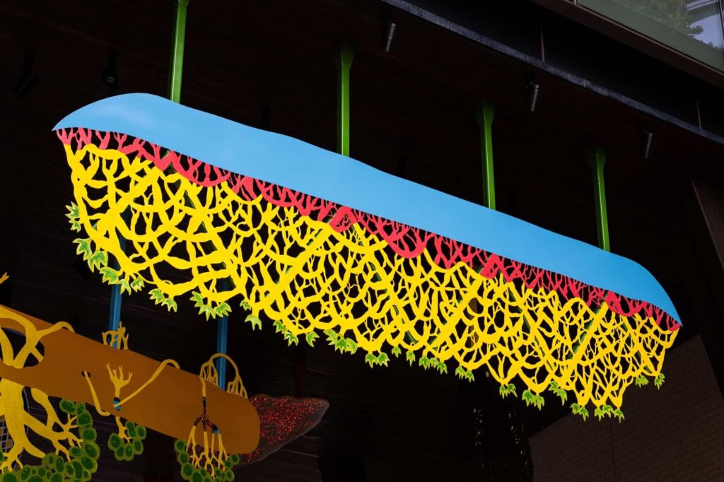 “We’re delighted to have worked with Jumaadi for his first public artwork, creating a fantastical world of colourful sculptures to enliven Barangaroo South. The interplay between negative and positive shapes within the hanging forms creates a pattern sometimes dense and opaque like the roots of a tree or gauzy and translucent like cloth or the shape of leaves against the sky. Natural light by day and spotlights at night cast shadowed silhouettes that make for endless discovery as you view it from different perspectives,” said curators Glenn Barkley and Holly Williams.
