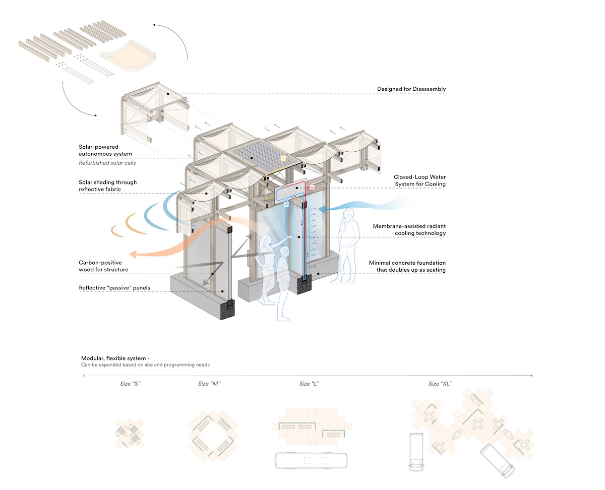 Constructed from 4×4 foot panels and costing around $75 per square foot to mass-produce, KlimaKover delivers radiant cooling and heating without condensation, operates entirely on solar power and requires no external water. The system circulates chilled water through microtubes in transparent radiant panels, drawing heat directly from the body. Fabric shading reduces heat exposure while maintaining open-air conditions and allowing natural breezes. The radiant panels can operate in hot and humid climates, protected from condensation by an infrared transparent membrane. “Research from our partners at the University of Pennsylvania shows that the panels start to cool your body within five to seven minutes, when the effect becomes apparent, and by 20 minutes the cooling sensation is pronounced,” says Kritika Kharbanda, Head of Sustainability at Henning Larsen.