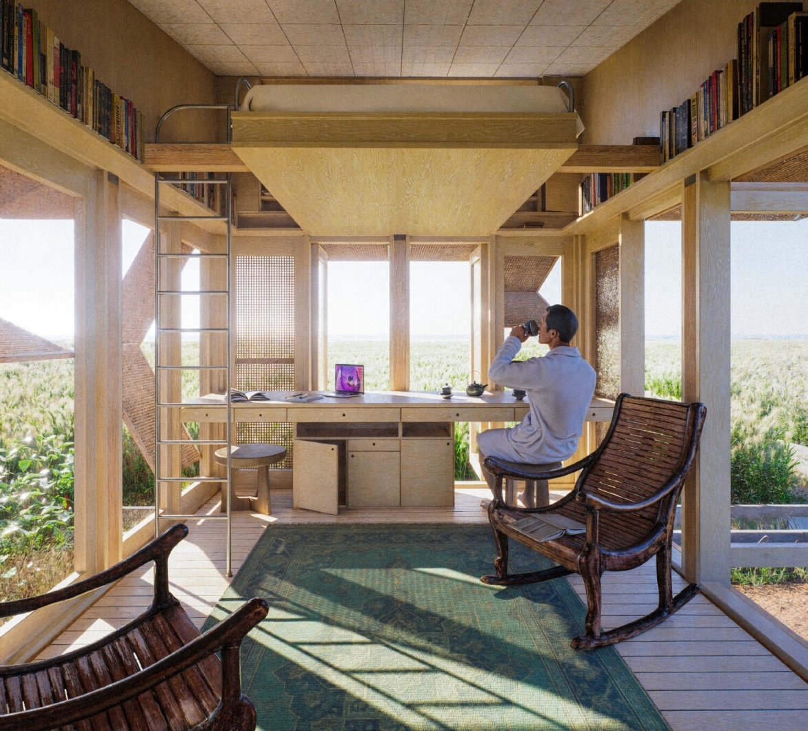 Spatially, the home is organised around a raised timber frame and a permeable façade system that mediates between interior domestic functions and the surrounding landscape. A lofted sleeping platform maximises usable floor area, while modular cabinetry and convertible work surfaces reinforce efficiency within the constrained footprint. Prefabricated wall and roof assemblies streamline construction and enable replication across rural contexts.