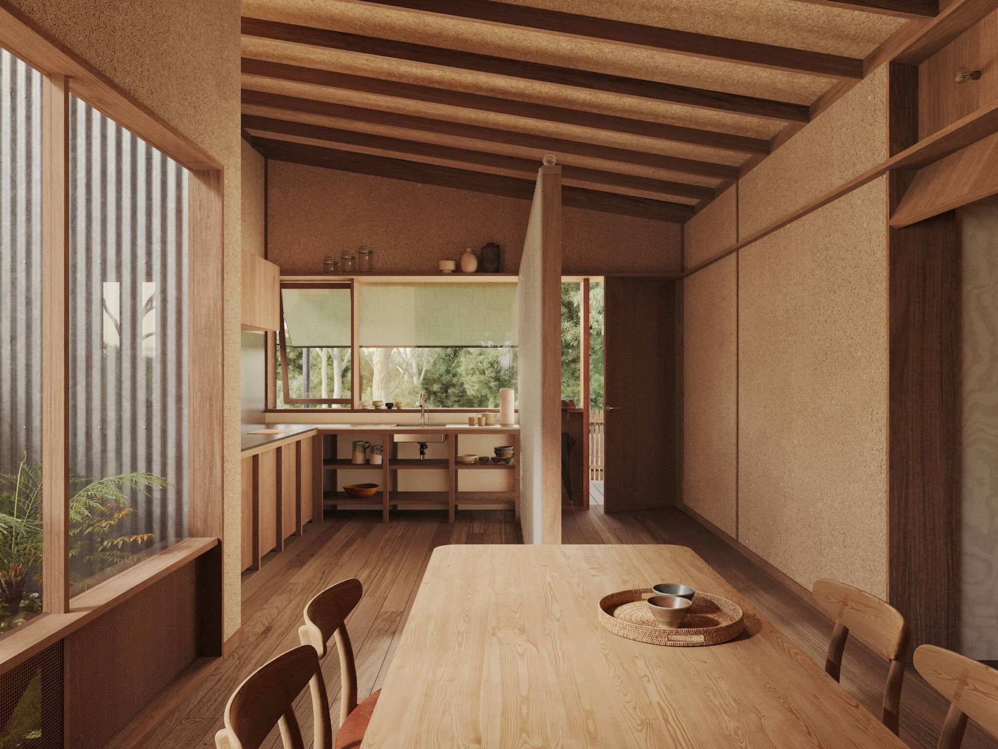 Exposed hempcrete walls provide raw texture, natural performance and enduring strength, while integrated timber joinery adds warmth and refinement to pared-back interiors.