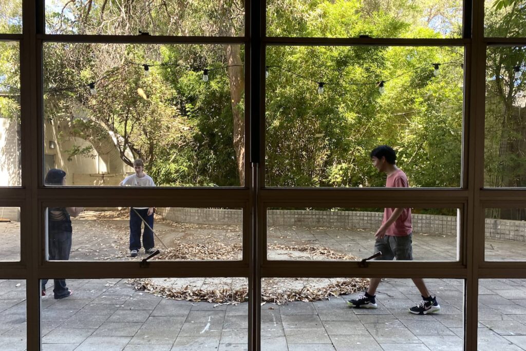 Using only what’s already there — the place as it is found, including leaves, brooms and rakes — the work adds nothing. Instead, accumulated dirt is cleaned away from the paving into a circular shape that might, or might not become a place to sweep leaves into or out of, subtracting instead of adding to the energetic field of enormous productivity.